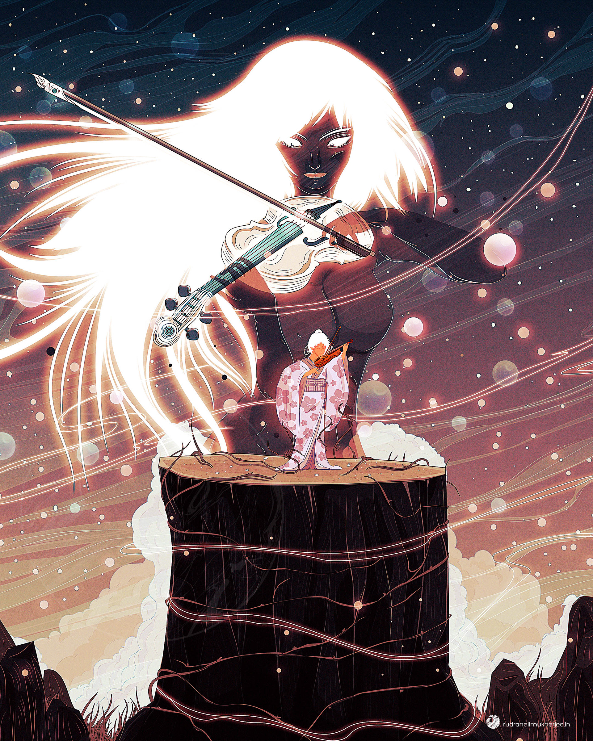 A fantasy themed illustration based on music and the colour palette of the setting sun as it transitions into the night.